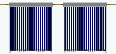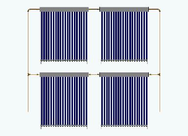 The heat dump circuit is shown in blue. Note that this diagram does not represent the physical positioning of the various components, the heat dump radiator is normally placed in an attic. The components provided in a typical pumping station such as a Flowcon A are shown outlined in green. The red lines represent electrical connections. The solar plumbing is essentially the same when using an unvented, pressurised hot water cylinder, where the cylinder is fed directly from the water main and the cold water tank is absent. In this case various components not shown on the schematic, including an additional expansion vessel, are required to ensure the safe operation of the cylinder. Note that the various plumbing components are on the return leg to the collector, which is cooler than the hot water cylinder feed (the solar fluid circulates in an anticlockwise direction here). The Evacuated tube collector includes a stainless steel frame which is designed to be mounted on a pitched roof. In order for the heat pipe to work, the collector must be between 15° and 90° to the horizontal. In order to collect the maximum amount of heat, (here in the Midlands, UK) it should be at an angle of around 30° to the horizontal. However, up to 15° either way makes little difference, which conveniently includes most standard roof pitches. All things being equal, a steeper inclination will enhance the winter heat collection, and a flatter one the summer. Bear in mind though that the great majority of insolation occurs in the summer, so optimising for the winter will reduce the net energy collected through the year. Similarly, the roof should ideally face due south, but anywhere between southeast and southwest will give satisfactory results. Choose a position on the roof which is not shaded, and consider that shading in a particular place may be more severe in winter when the sun is lower in the sky. See here for more on this. Mounting the collector Be aware that safe access to the roof is required to install the collector, and that a body of legislation exists governing safe working at height which applies to commercial installers. While this legislation appears not to cover DIY installers, this does not make injury less likely!. A scaffold tower and a pair of roof ladders with a platform between would appear to be the minimum requirement. These can be hired at modest cost from national hire companies. The collector frame and header manifold is usually best assembled on the ground (without the tubes, see assembly instructions here) and then lifted onto the roof. The approved method is to use a hoist mounted on the scaffold tower. The panel is usually fixed to the roof in one of two ways. Generally the simplest way to fix the collector frame to the roof is to use stainless steel straps. These are fed between the tiles or slates and wrapped around and screwed to the roofing battens in the loft. Note that a slot must be cut in the sarking felt under the tiles or slates. Poke the strap between the tiles and have an assistant cut the felt in the right place. Be sure that the battens are sufficiently strong, and if in doubt, fit a trimmer between two rafters. Use one strap at each corner, and bolt the frame to the external end of each strap. The frame must be lifted a little from the roof to give access to the bolt for a socket. Take an offcut of 4 x 2 or similar to support the frame while doing this. For the Eco-58-1800-30, an additional two mounts are used at the centre. The advantage of this method is that no penetration of the roof is required for mounting the panel. Alternatively, for a slightly more positive fitting, use a threaded coach bolt. With this technique, lay the frame on the roof and drill holes in the tiles to match the holes in the vertical frame rails. Use a 9 or 10mm masonry drill and go gently without percussion action to avoid cracking. For very hard tiles try using a glass drill. It should be possible to drill two of the holes above a rafter by careful positioning (use a piece of flat strip as a probe). For the other two holes, cut 4" x 2" trimmers so that they are snug fit between the two rafters and nail them in place. Drill a 5mm pilot hole through the tiles in the timber to the full depth that the bolts will be sunk, and then screw in the bolts, leaving sufficient proud of the tiles to attach the frame. Use silicon sealant to make good the waterproofing around the bolt, and then fasten the rubber washer against the tile with a nut. Do not overtighten as this may crack the tile. When all bolts are in place, install the frame and secure with nuts. Do not install the collector tubes until the circuit plumbing is complete and the system filled with coolant. Placing the tubes in an unfilled manifold will quickly result in a very hot (and potentially dangerous) panel! Collector Arrays Two large collectors may be plumbed together in series, but for an array of more than two (for commercial or other high volume use) it is recommended that they should be connected in groups of two in parallel to reduce pumping losses, and also reduce the risk of overheating in summer. Two Panels plumbed in series. Four panels plumbed two by two in parallel. Solar Circuit Plumbing Use 15mm copper connected to the panels via compression fittings. Plastic pipe should not be used as it will not stand up to the prolonged high temperatures which the panels can produce. Solder joints should be avoided as, in a stagnation situation where water for some reason is no longer being circulated through the panel the temperature of the manifold could exceed the melting point of the solder. Ordinary white PTFE joint sealing tape is fine for use in high temperature applications, for example at the pump station connections.. The pipe runs must be insulated with high temperature pipe insulation, for example Armaflex HT. Ordinary insulation for hot water pipes may well melt at some stage. Care should be taken where the pipes penet